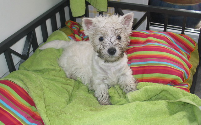 Die Bindung die diese Maus nun zu mir aufbaute ist einfach phänomenal und ich war überglücklich als sie am Ende der fünften Woche glücklich die ersten Schritte durch unseren Rasen im Garten hinter mir her schritt. Das wir diese Maus NICHT abgegeben haben ist wohl klar – sie hat bisher schon fast die richtige Größe erreicht ist purz gesund und rotz frech, super schnell im Rennen durch den Garten, ist der LIEBLING von ALLEN selbst Rudelführer und Mutter können ( oder ich meine eigentlich WOLLEN ) sie nicht bändigen. Bis jetzt hat sie sich zu einem sehr süssen ( war sie eigentlich IMMER schon) Westiemädchen entwickelt, hat ihre Zahnung erfolgreich abgeschlossen, ganz dem Ziel SCHNAUZE VOLL!!!
