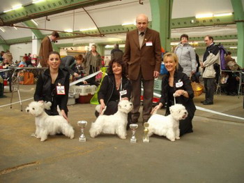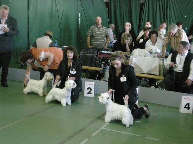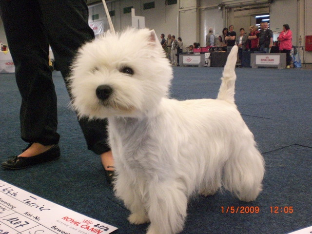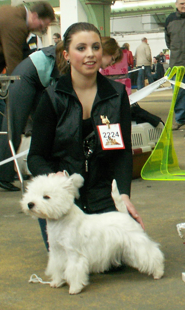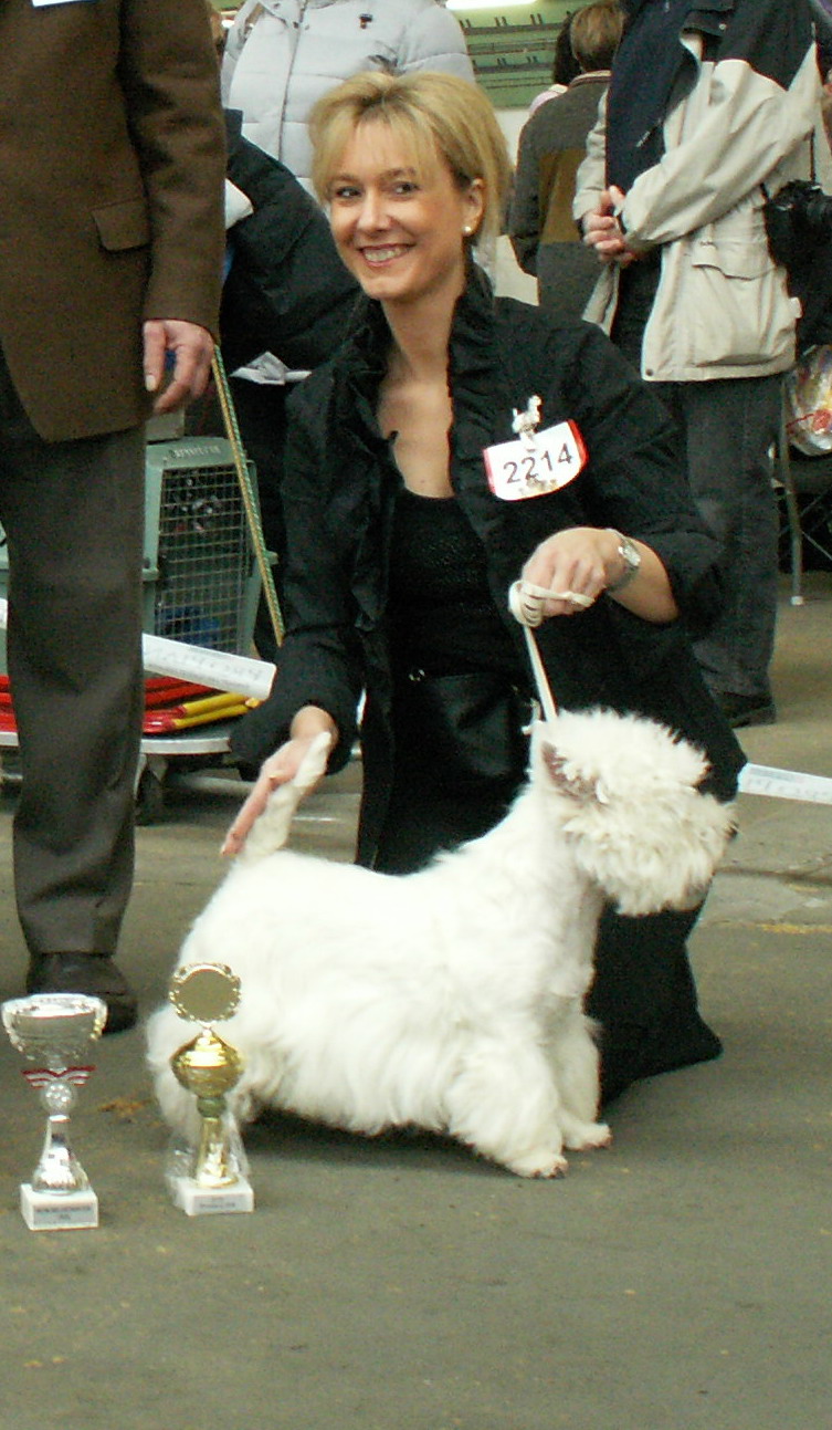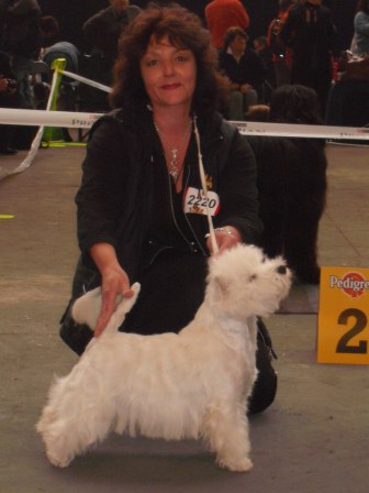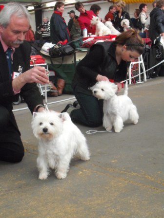 Was soll ich sagen, nun nicht in Ausstellerdress und mit nicht fertigen Hund betrat ich den Ring und wollte noch schnell mit den kleinen Striegel das eine oder andere retten,----höre ich die Stimme der bis jetzt mir unbekannten Richterin; BITTE auf den Tisch!! Ja, SIE BITTE , oh nein, dachte ich - ich könne noch was retten und den Hund wenigstens noch aufbürsten, nach kurzer Beschreibung warum CHRISSY nicht ausstellungsmäßig zurecht gemacht ist, und die Richterin mir erklärte, tja eine Rassenverschiebung -SIE könne auch nicht dafür- und ich mich kurz vor einer Herzattacke befand, taten die beruhigenden Worte Von Frau Kuratko, der Richterin, sehr gut - viel genutzt hat es mir jedoch nicht. Sie begutachtete meine Chrissy, wir mussten Laufen und sie beäugte das Gangwerk, bitte noch einmal Laufen und Aufbauen, DANKE! Diese Worte hörte ich wie aus der Ferne, gingen mir doch Sachen, wie so weite Fahrt( fast 1000km) , Übernachtungen, nun eine schlechte Beurteilung KEINE Anwartschaften usw, durch den Kopf, und hörte dann, SIE können sich bitte wieder in die Reihe stellen, DANKE!! Tja, DAS war dann wohl gelaufen- die Richterin erhob abermals ihre Stimme und BITTE ALLE - LAUFEN, ja noch eine Runde, nun SIE noch einmal und SIE, Bitte SIE und SIE nochmal, Ja, herzlichen Glückwunsch, V1 Jugend CAC KFT und Jugend CAC VDH ;ich sehe Sie dann gleich wieder im BOB Ring! UND DAS WAREN................. CHRISSY UND ICH!! Viele die am Ring das Geschehen verfolgt hatten, klatschten begeistert und man muss nun noch hinzu fügen, nach dem Richten bin ich überglücklich zur Richterin gegangen um, sie kurz zu sprechen . war mir doch aufgefallen, das sie sehr zögerte im BOB -Ring den Sieger auszumachen. Hocherfreut gestand sie mir, ja ich wollte eigentlich die kleine Maus zum BOB wählen, habe mich aber nicht getraut da sie mir sagten, wie jung sie noch ist, ich wollte nicht das sie überfordert wird! Das war dann wohl eine Freude, jedoch sagte ich ihr dann, hätten sie ruhig tun sollen, MUTTER, wie auch GROßMUTTER der kleinen CHRISSY sind schon BOB im zarten Alter von 9 und 11 Monaten geworden!! So sieht man, es gibt doch noch verantwortungsbewusste und vor allem kompetente unabhängige Richter, die wissen was sie wollen.