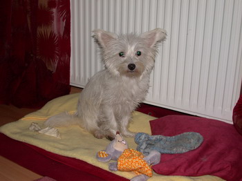 "MARLEY "ist wohl eine Mischung aus Yorkie und Westie und wurde ganz allmählich und vorsichtig von mir getrimmt und entwickelt nun ein festeres und dichteres Fell. Gaby hatte zuvor sehr viel Arbeit und Mühe das doch sehr verstörte und verwahrloste Tier in einen glücklichen und gepflegten Hund zu verwandeln.